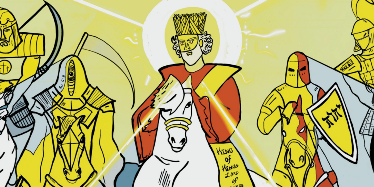 Jesus Christ in the center of this image returning to Earth on His white horse as depicted in the book of Revelation.